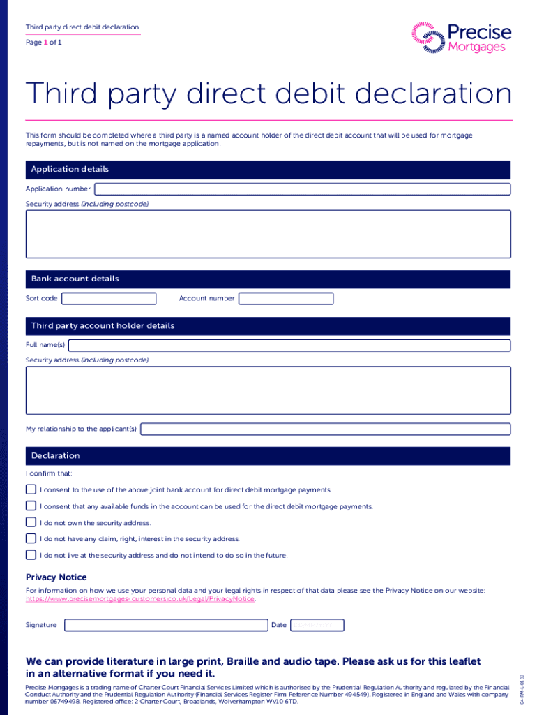 Third party direct debit declaration Page 1 of 1Third party direct debit declaration This form should be completed where a third party is a named account holder of the direct debit account that will