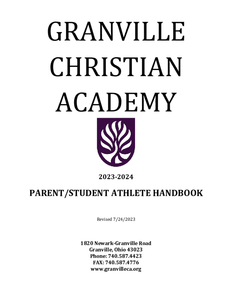 GRANVILLE CHRISTIAN ACADEMY 20232024PARENT/STUDENT ATHLETE HANDBOOK Revised 7/24/20231820 NewarkGranville Road Granville, Ohio 43023 Phone: 740.587.4423 FAX: 740.587.4776 www.granvilleca.orgTable
