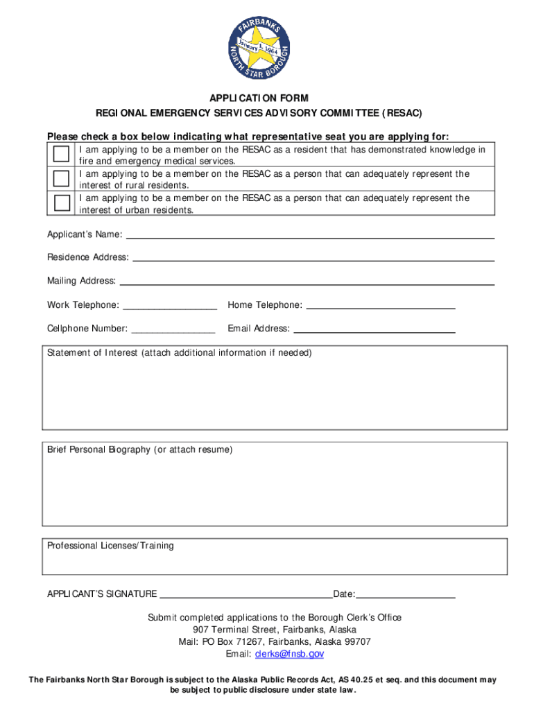 APPLICATION FORM REGIONAL EMERGENCY SERVICES ADVISORY COMMITTEE (RESAT) Please check a box below indicating what representative seat you are applying for: I am applying to be a member on the RESAT