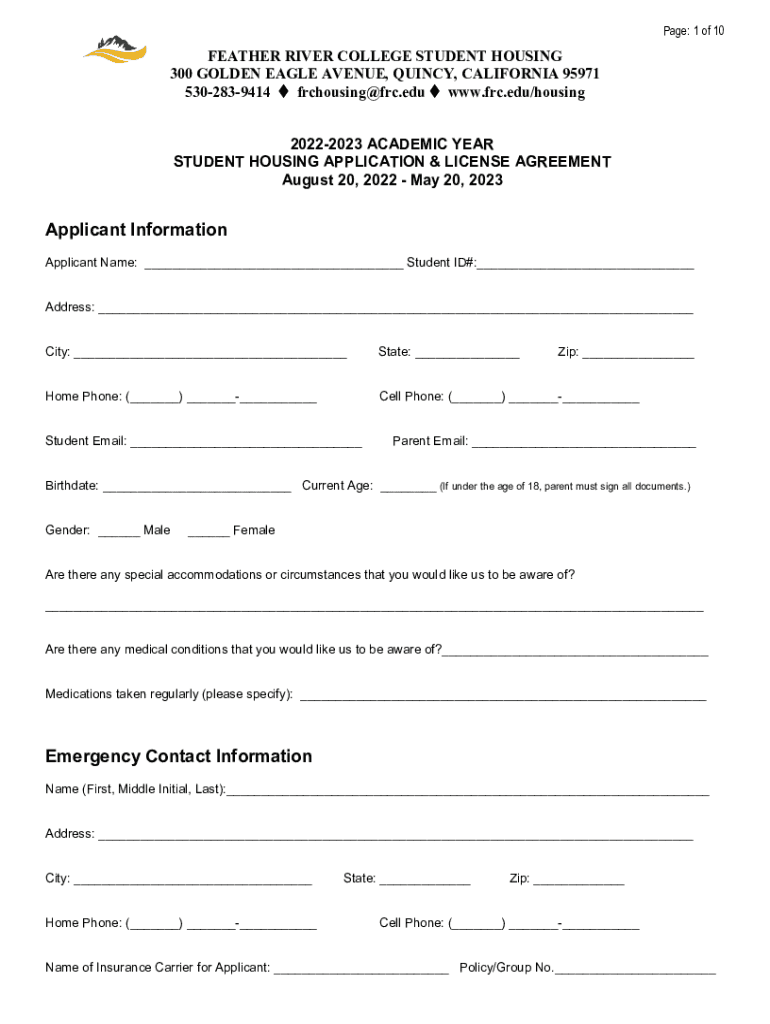 Page: 1 of 10FEATHER RIVER COLLEGE STUDENT HOUSING 300 GOLDEN EAGLE AVENUE, QUINCY, CALIFORNIA 95971 5302839414 frchousing@frc.edu www.frc.edu/housing 20222023 ACADEMIC YEAR STUDENT HOUSING APPLICATION