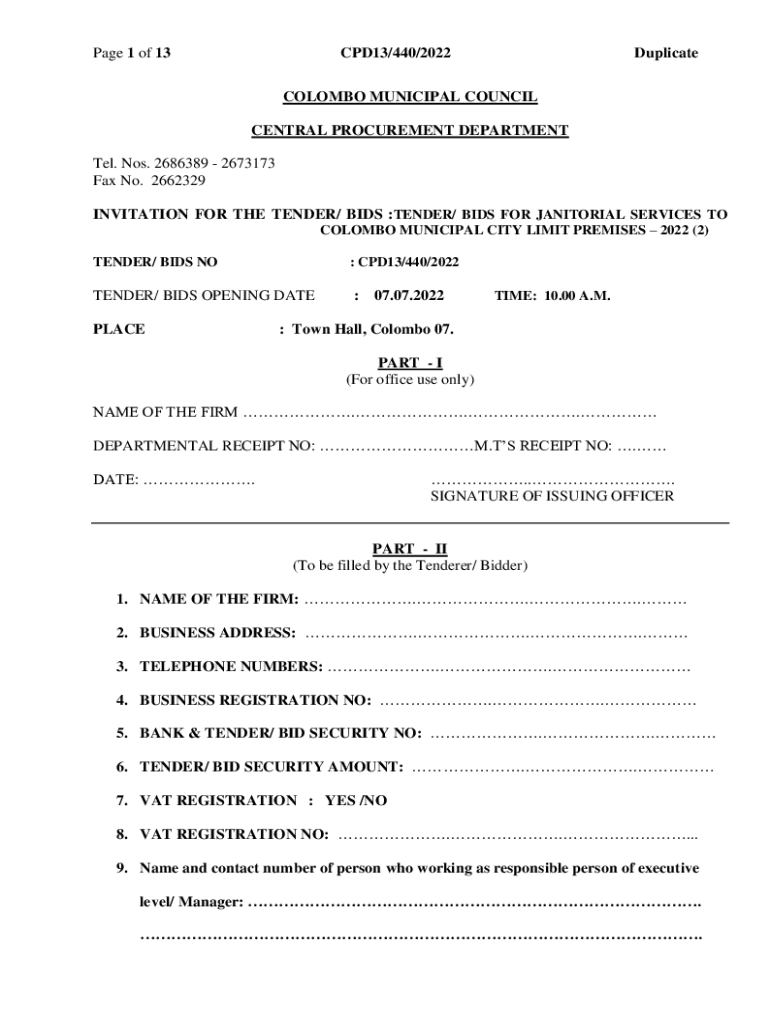 Page 1 of 13CPD13/440/2022DuplicateCOLOMBO MUNICIPAL COUNCIL CENTRAL PROCUREMENT DEPARTMENT Tel. Nos. 2686389 2673173 Fax No. 2662329 INVITATION FOR THE TENDER/ BIDS :TENDER/ BIDS FOR JANITORIAL SERVICES
