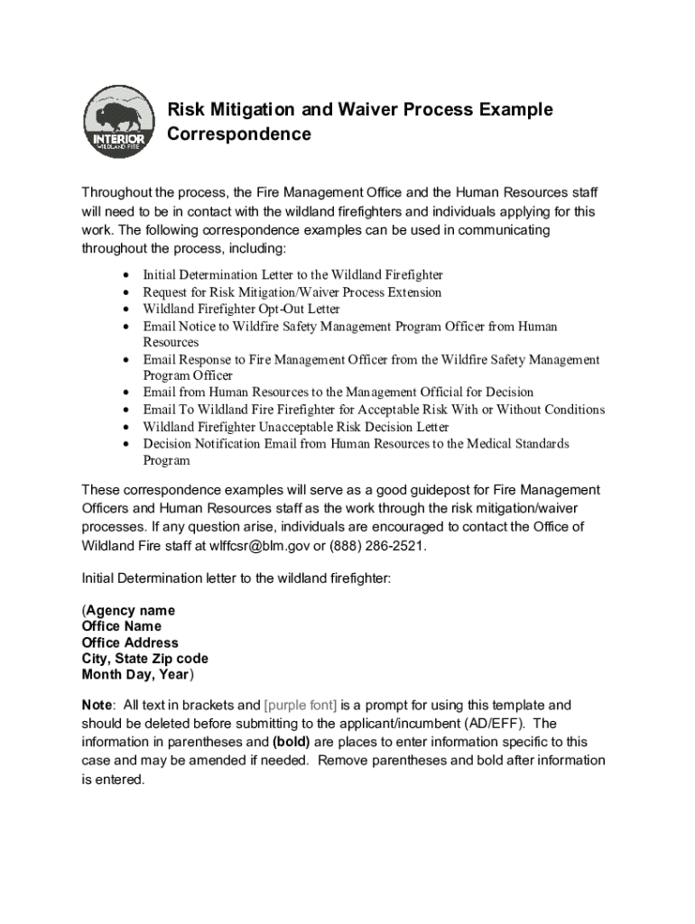 Risk Mitigation and Waiver Process Example Correspondence Throughout the process, the Fire Management Office and the Human Resources staff will need to be in contact with the wild land firefighters