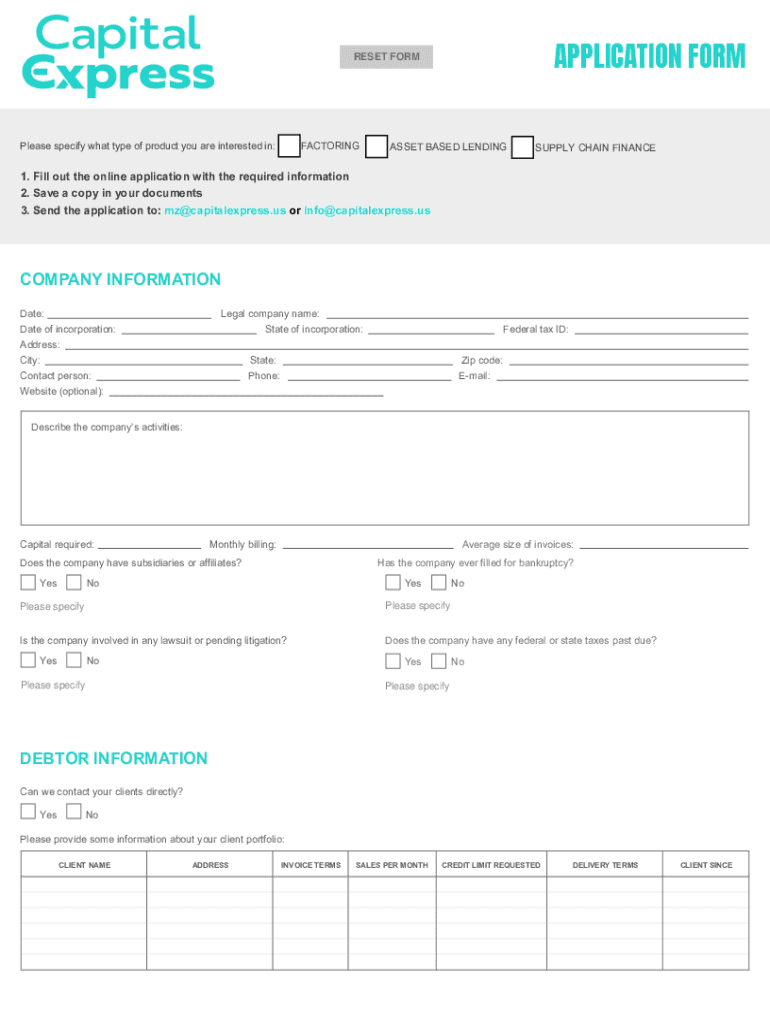APPLICATION FORREST Formulas specify what type of product you are interested in:FACTORINGASSET BASED LENDINGSUPPLY CHAIN FINANCE1. Fill out the online application with the required information