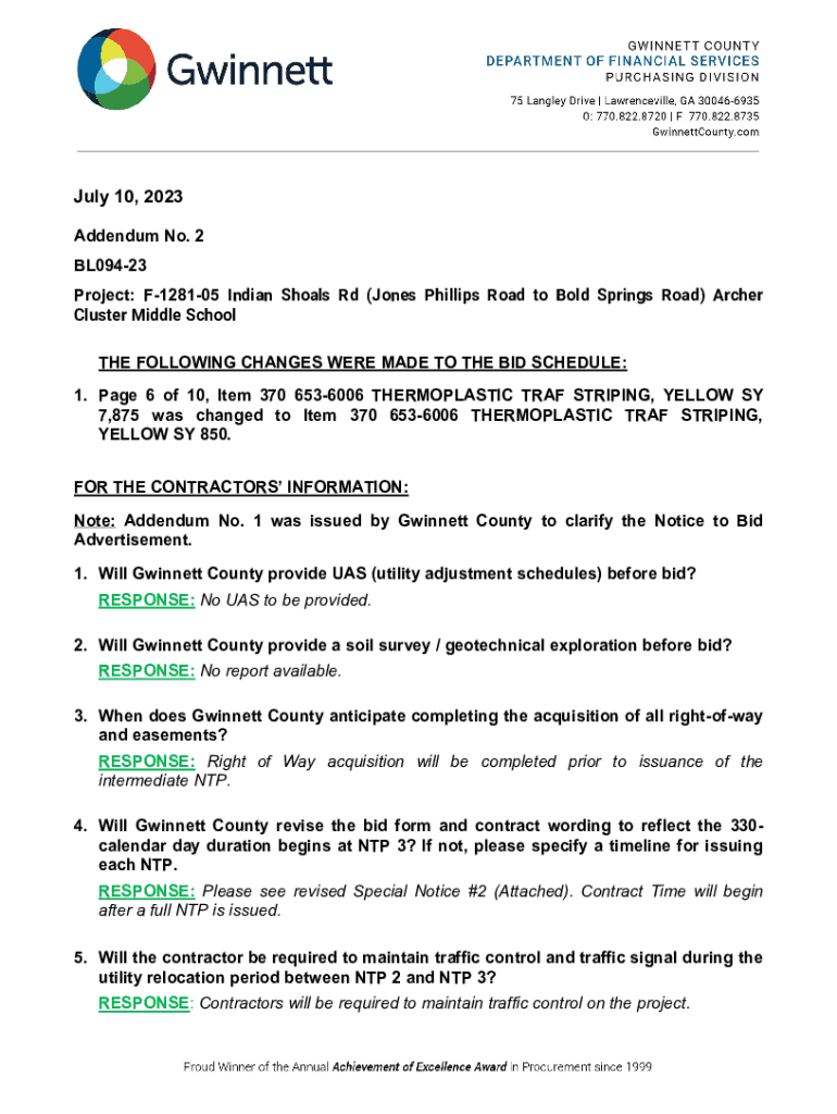 July 10, 2023, Addendum No. 2 BL09423 Project: F128105 Indian Shoals Rd (Jones Phillips Road to Bold Springs Road) Archer Cluster Middle School THE FOLLOWING CHANGES WERE MADE TO THE BID SCHEDULE: