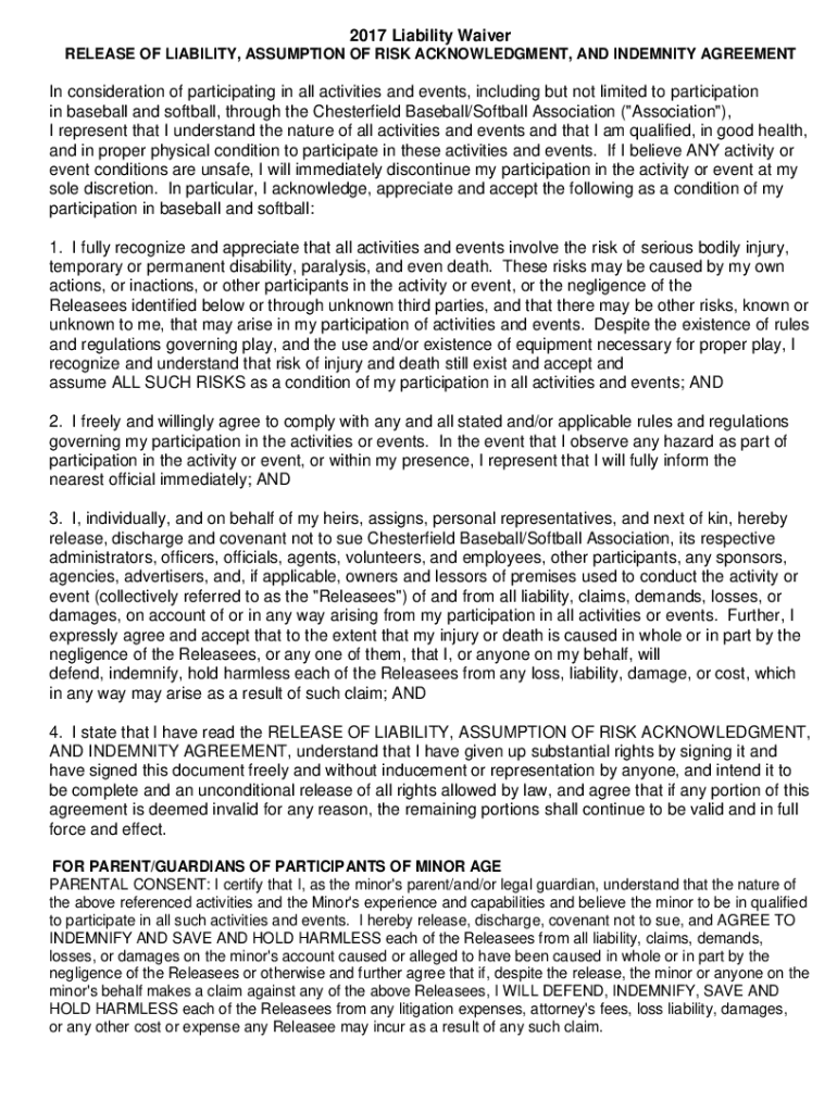 2017 Liability Waiver RELEASE OF LIABILITY, ASSUMPTION OF RISK ACKNOWLEDGMENT, AND INDEMNITY AGREEMENT In consideration of participating in all activities and events, including but not limited to
