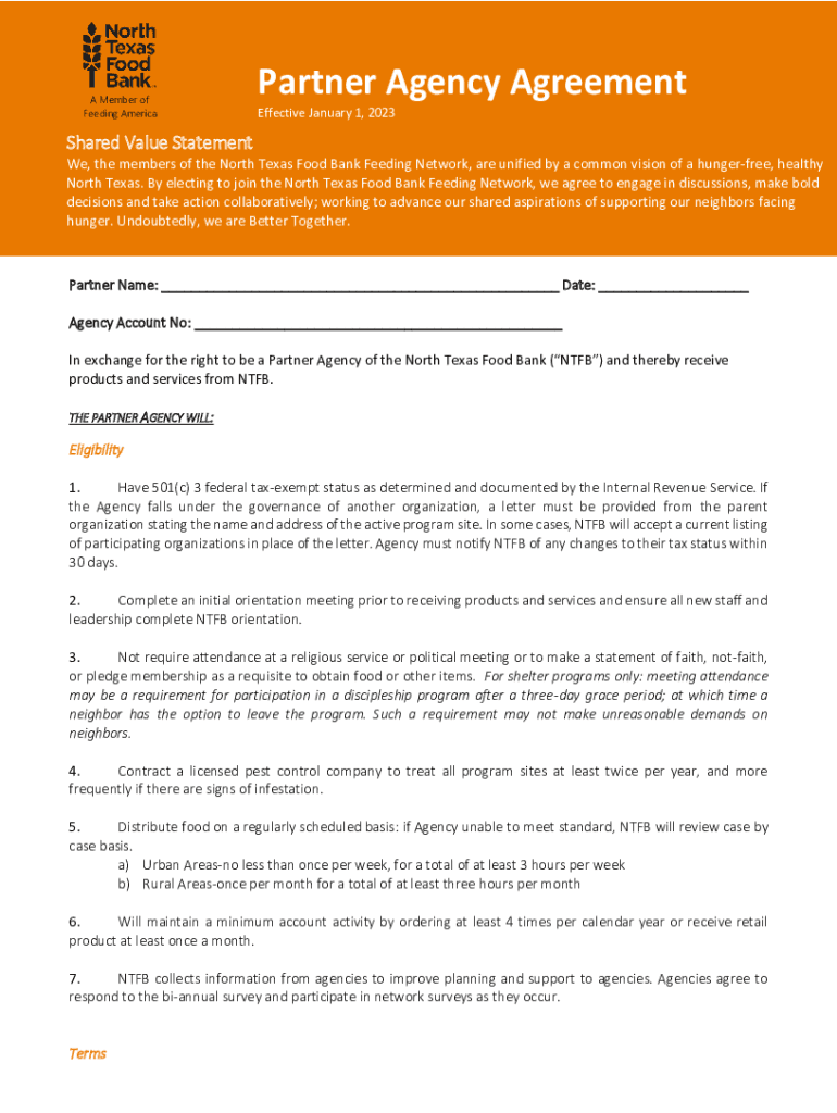 A Member of Feeding AmericaPartner Agency Agreement Effective January 1, 2023Shared Value Statement We, the members of the North Texas Food Bank Feeding Network, are unified by a common vision of