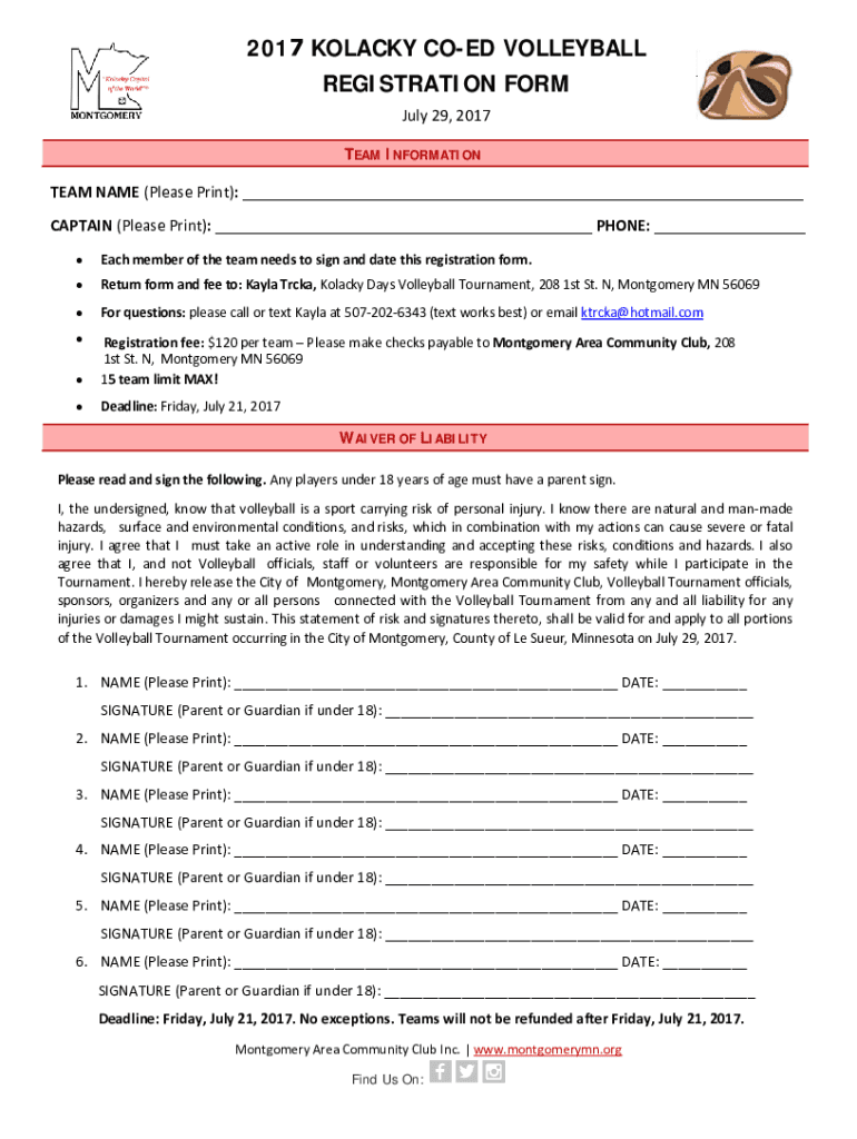 2017 KOLA CKY COED VOLLEYBALL REGISTRATION FORM July 29, 2017, TEAM INFORMATIONAL NAME (Please Print): ___ CAPTAIN (Please Print): ___ PHONE: ___ Each member of the team needs to sign and date this
