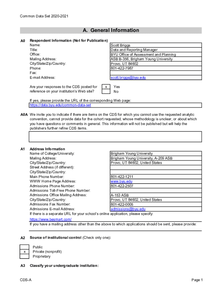 Common Data Set 20202021A. General Information A0Respondent Information (Not for Publication) Name: Title: Office: Mailing Address: City/State/Zip/Country: Phone: Fax: Email Address: Are your responses