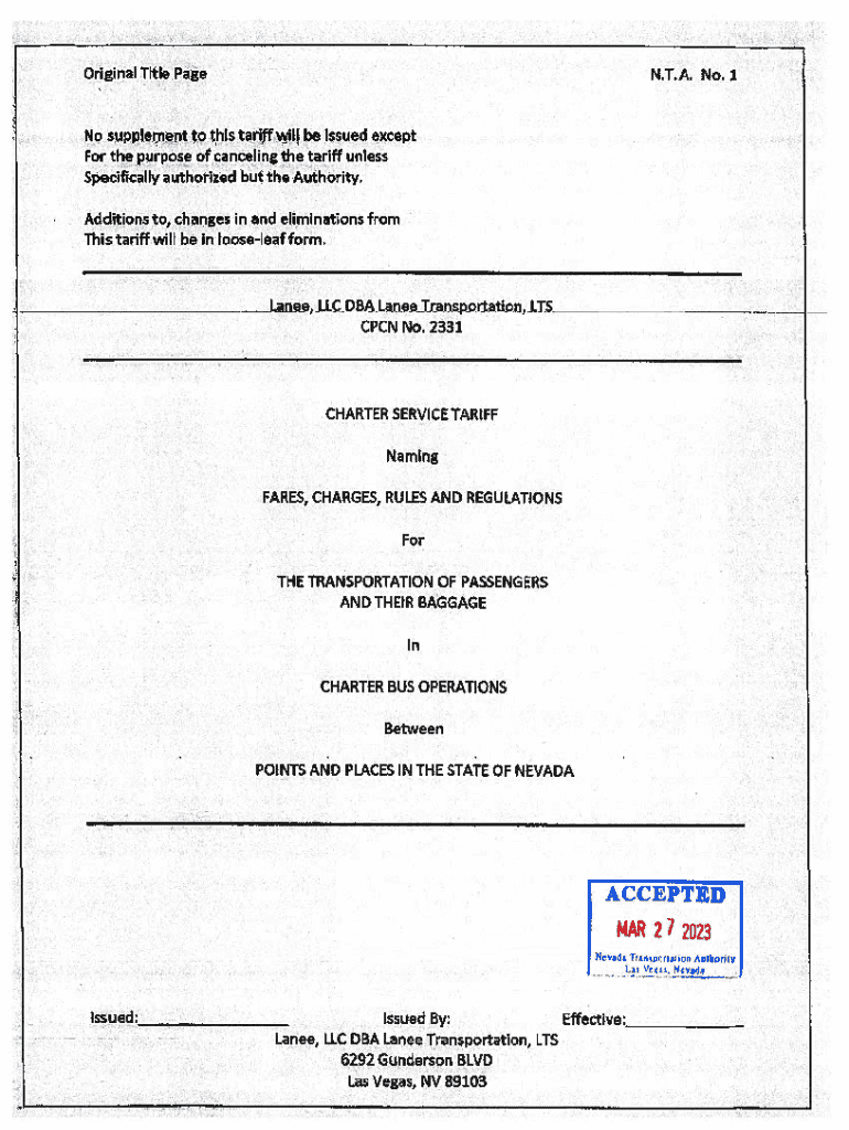 Lanee Transportation or any entity providing transportation services is required to file the lanee transportation 2331 tariff.
