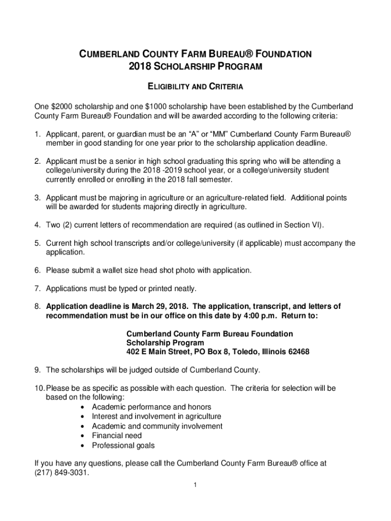 CUMBERLAND COUNTY FARM BUREAU FOUNDATION 2018 SCHOLARSHIP PROGRAM ELIGIBILITY AND CRITERIA One $2000 scholarship and one $1000 scholarship have been established by the Cumberland County Farm Bureau