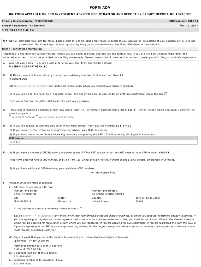 FORM ADV UNIFORM APPLICATION FOR INVESTMENT ADVISER REGISTRATION AND REPORT BY EXEMPT REPORTING ADVISERS Primary Business Name: RIVERBRIDGECRD Number: 108074Annual Amendment All Sections Rev. 10/20213/29/2023