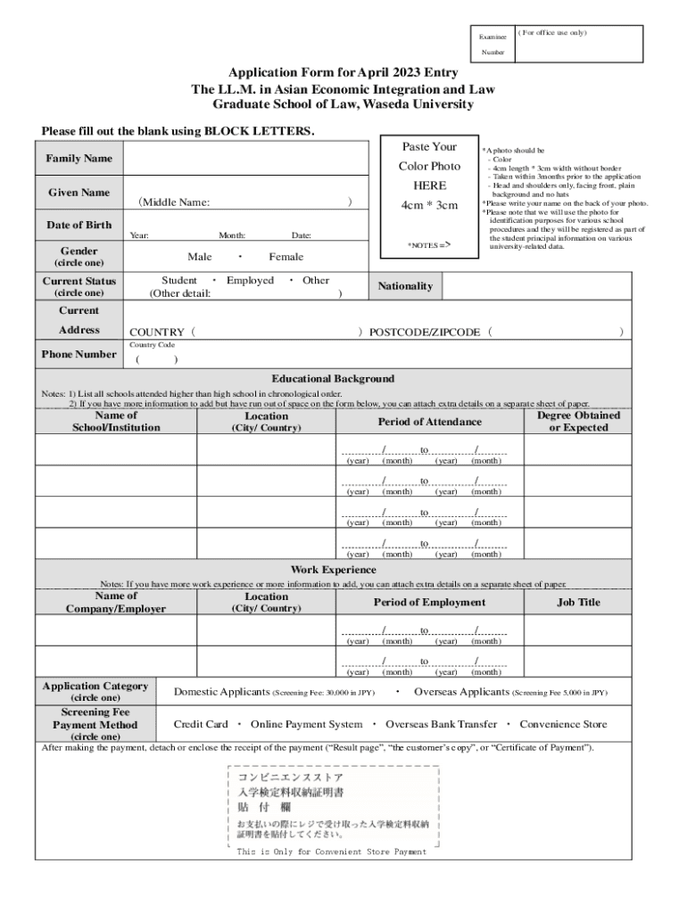 Examinee(For office use only)Number Application Form for April 2023 Entry The LL.M. in Asian Economic Integration and Law Graduate School of Law, Based University Please fill out the blank using BLOCK