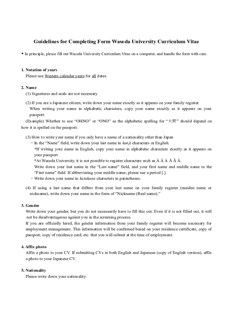 Guidelines for Completing Form Based University Curriculum Vitae In principle, please fill out Based University Curriculum Vitae on a computer, and handle the form with care.1. Notation of years Please