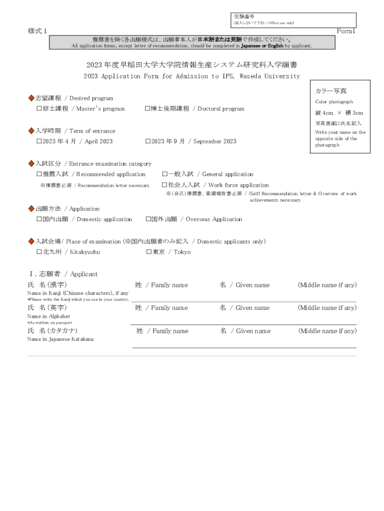 /Office use only 1Form1 All application forms, except letter of recommendation, should be completed in Japanese or English by applicant.2023 2023 Application Form for Admission to IPS, Based University