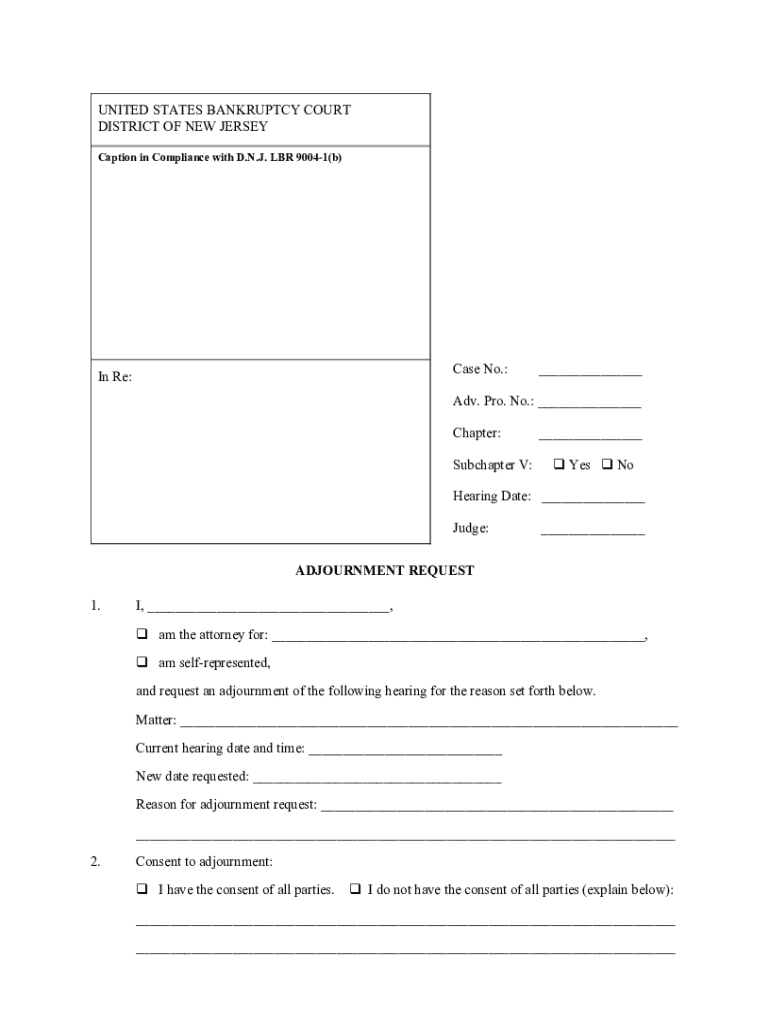 UNITED STATES BANKRUPTCY COURT DISTRICT OF NEW JERSEY Caption in Compliance with D.N.J. LB 90041(b)Case No.:In Re:___Adv. Pro. No.: ___ Chapter: Subchapter V:___ Yes Hearing Date: ___ Judge:___ADJOURNMENT