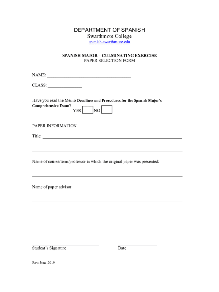 DEPARTMENT OF SPANISH Swarthier College Spanish.swarthier. Spanish MAJOR CULMINATING EXERCISE PAPER SELECTION FORM NAME: ___ CLASS: ___ Have you read the Memo Deadlines and Procedures for the Spanish