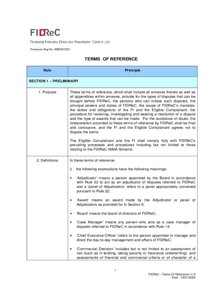 TERMS OF REFERENCE RulePrincipleSECTION 1 PRELIMINARY 1. Purposeless terms of reference, which shall include all annexes thereto as well as all appendices within annexes, provide for the types of