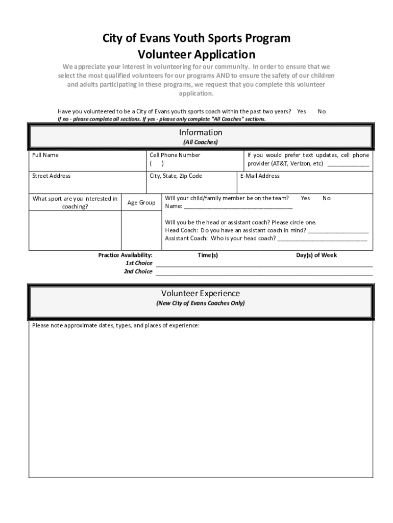 City of Evans Youth Sports Program Volunteer Application We appreciate your interest in volunteering for our community. In order to ensure that we select the most qualified volunteers for our programs