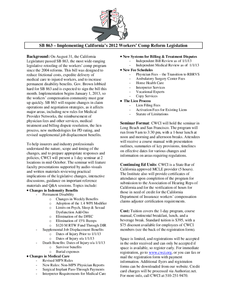 SB 863 Implementing California's 2012 Workers Comp Reform Legislation Background: On August 31, the California Legislature passed SB 863, the most wide ranging legislative retooling of the workers
