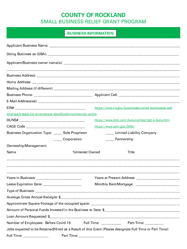 COUNTY OF ROCKLAND SMALL BUSINESS RELIEF GRANT PROGRAM BUSINESS INFORMATION Applicant Business Name: ___ Doing Business as (DBA): ___ Applicant/Business owner name(s): ___ ___ Business Address: ___