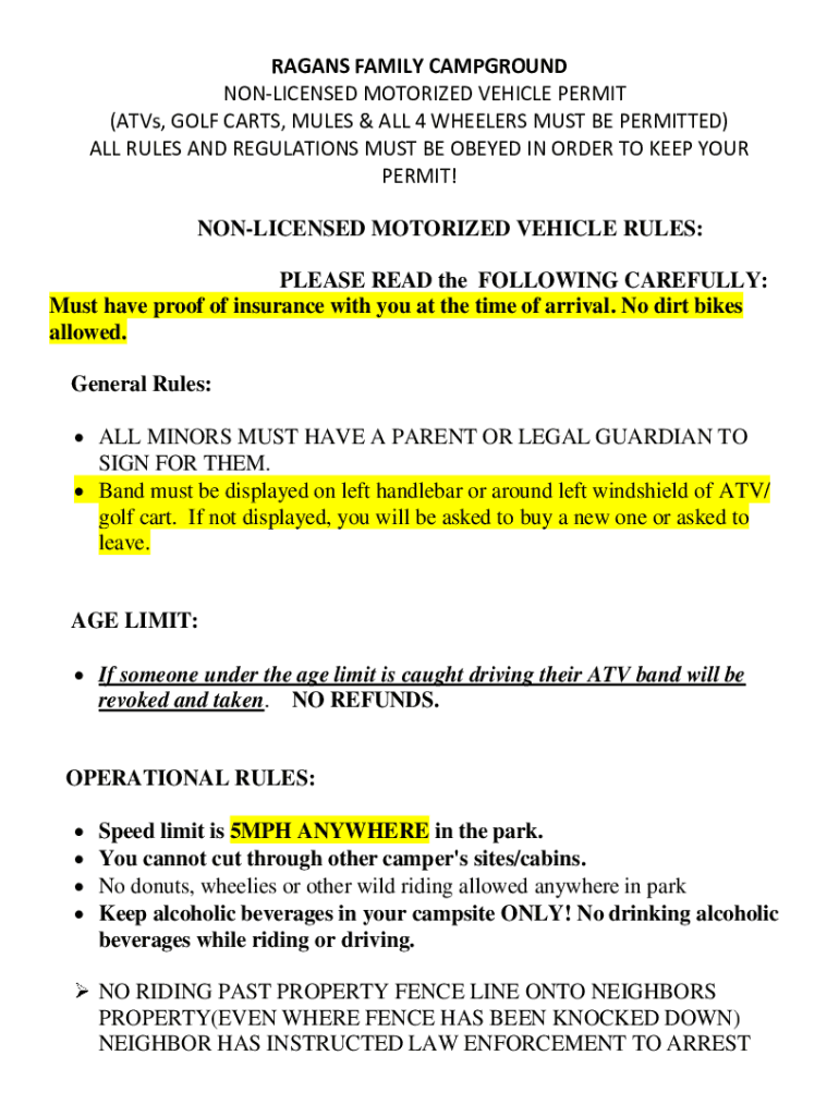 PAGANS FAMILY CAMPGROUND UNLICENSED MOTORIZED VEHICLE PERMIT (ATVs, GOLF CARTS, MULES & ALL 4 WHEELERS MUST BE PERMITTED) ALL RULES AND REGULATIONS MUST BE OBEYED IN ORDER TO KEEP YOUR PERMIT! UNLICENSED