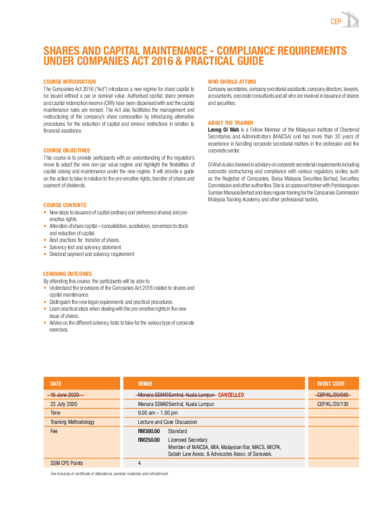 RESHARES AND CAPITAL MAINTENANCE COMPLIANCE REQUIREMENTS UNDER COMPANIES ACT 2016 & PRACTICAL GUIDE COURSE INTRODUCTION The Companies Act 2016 (Act) introduces a new regime for share capital to be