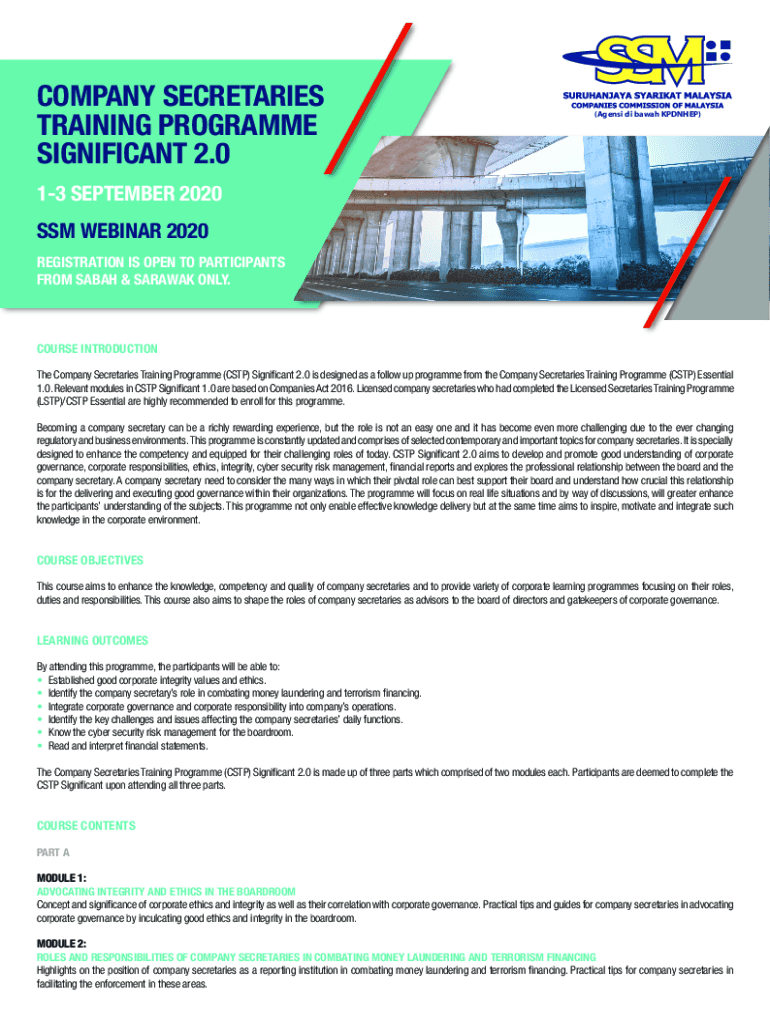 COMPANY SECRETARIES TRAINING Program SIGNIFICANT 2.0(Agency DI away KIDNEY)13 SEPTEMBER 2020 SSM WEBINAR 2020 REGISTRATION IS OPEN TO PARTICIPANTS FROM SARAH & SARAWAK ONLY.COURSE INTRODUCTION The