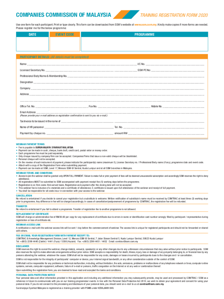 COMPANIES COMMISSION OF MALAYSIATRAINING REGISTRATION FORM 2020Use one form for each participant. Print or type clearly. This form can be downloaded from SSM's website at www.ssm.com.my. Kindly make