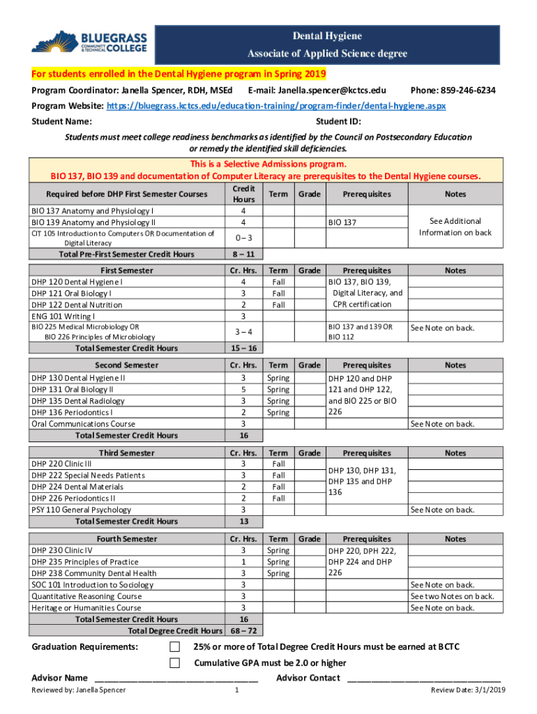 Dental Hygiene Associate of Applied Science degree For students enrolled in the Dental Hygiene program in Spring 2019 Program Coordinator: Janelle Spencer, RDS, MSEdEmail: Janella.spencer@kctcs.eduPhone:
