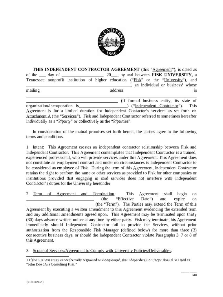 What is FISKStandard Independent Contractor Agreement2018 (01798020-2).DOCX. 01798020.2 /font8 Form?