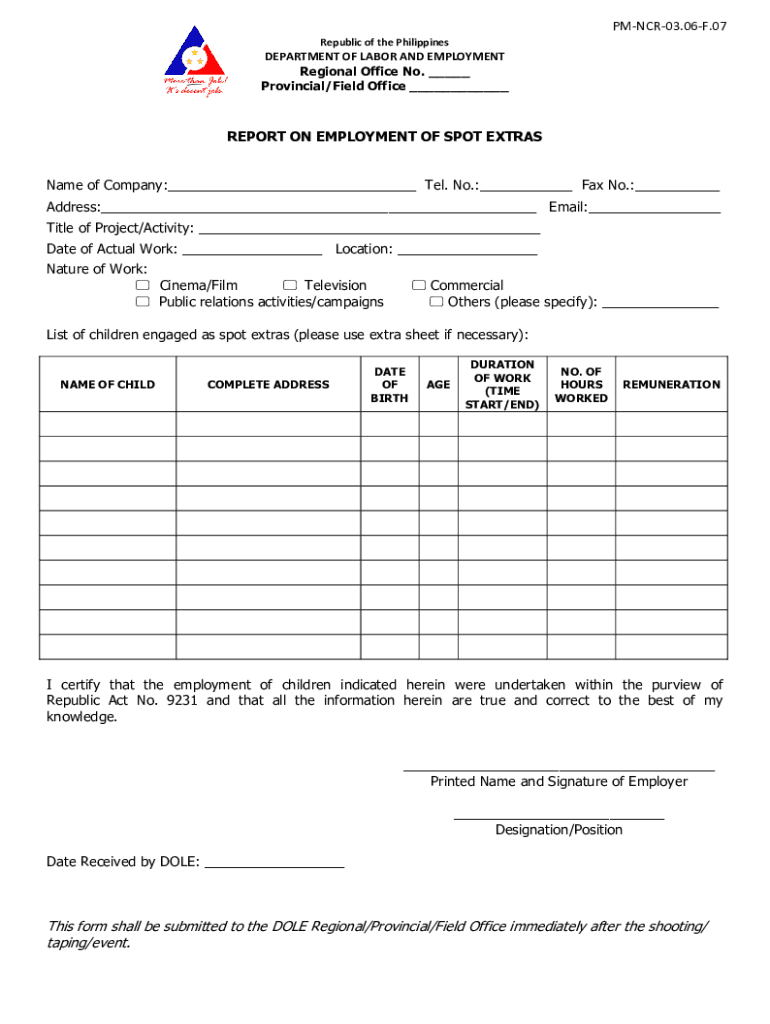 PMNCR03.06F.07 Republic of the PhilippinesDEPARTMENT OF LABOR AND EMPLOYMENT Regional Office No. ___ Provincial/Field Office ___REPORT ON EMPLOYMENT OF SPOT EXTRAS Name of Company:___ Tel. No.:___