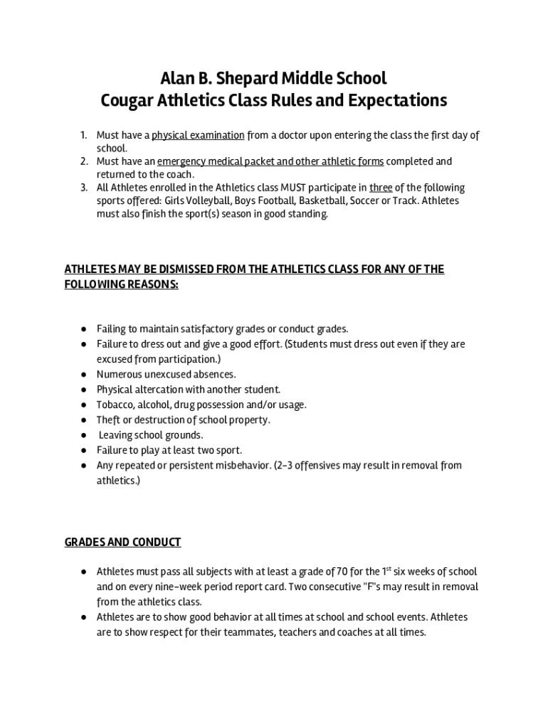 Alan B. Shepard Middle School Cougar Athletics Class Rules and Expectations 1. Must have a physical examination from a doctor upon entering the class the first day of school. 2. Must have an emergency