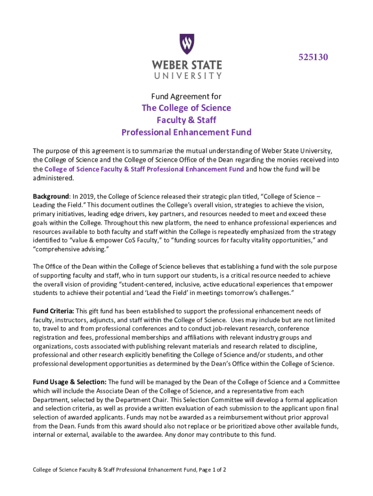 525130Fund Agreement forth College of Science Faculty & Staff Professional Enhancement Fund The purpose of this agreement is to summarize the mutual understanding of Weber State University, the College