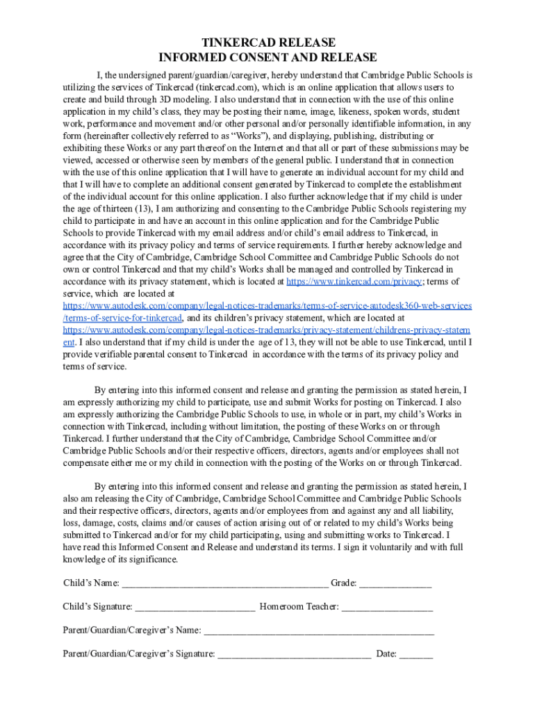 TINKERCAD RELEASE INFORMED CONSENT AND RELEASE I, the undersigned parent/guardian/caregiver, hereby understand that Cambridge Public Schools is utilizing the services of Tinkercad (tinkercad.com),
