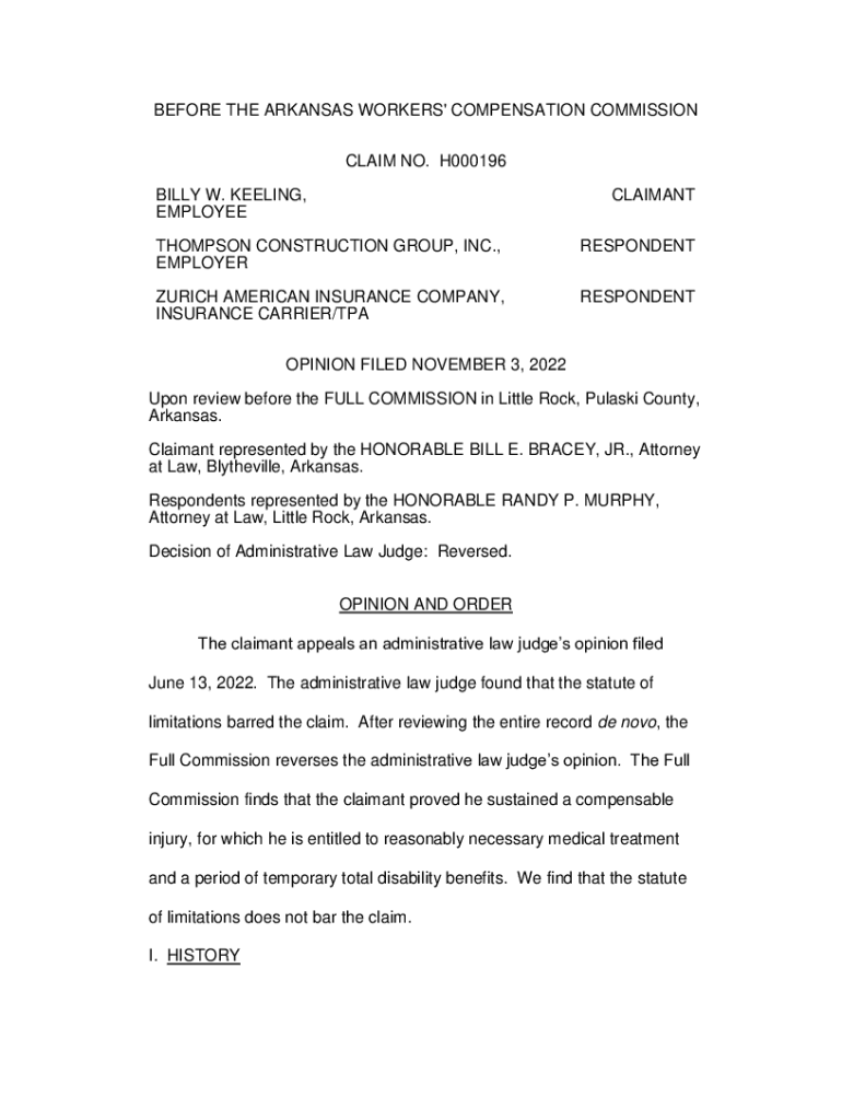 BEFORE THE ARKANSAS WORKERS\' COMPENSATION COMMISSION CLAIM NO. H000196 BILLY W. KEELING, EMPLOYEECLAIMANTTHOMPSON CONSTRUCTION GROUP, INC., EMPLOYERRESPONDENTZURICH AMERICAN INSURANCE COMPANY, INSURANCE