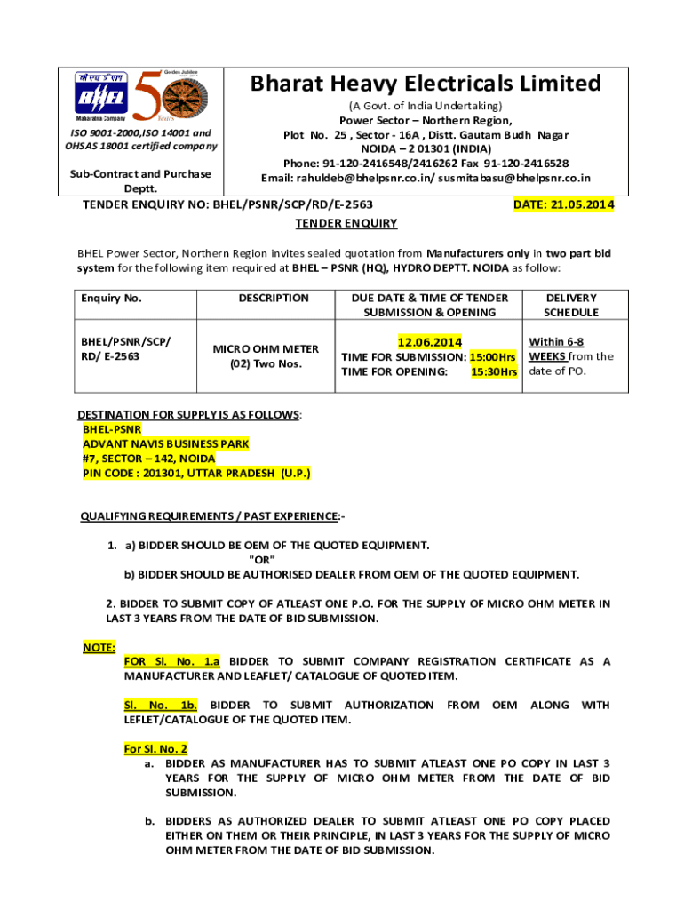 Bharat Heavy Electrical Limited ISO 90012000,ISO 14001 and OHSA 18001 certified companySubContract and Purchase Depth.(A Govt. of India Undertaking) Power Sector Northern Region, Plot No. 25, Sector