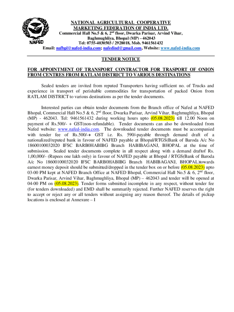 NATIONAL AGRICULTURAL COOPERATIVE MARKETING FEDERATION OF INDIA LTD. Commercial Hall No.5 & 6, 2nd floor, Dark Paris, Arvind Vicar, Baghmughliya, Bhopal (MP) 462043 Tel: 07554030503 / 2928018, Mob.