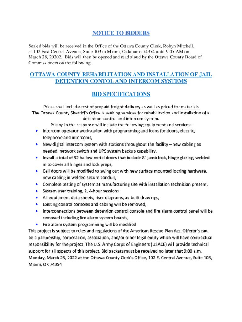 NOTICE TO BIDDERS Sealed bids will be received in the Office of the Ottawa County Clerk, Robyn Mitchell, at 102 East Central Avenue, Suite 103 in Miami, Oklahoma 74354 until 9:05 AM on March 28, 20202.