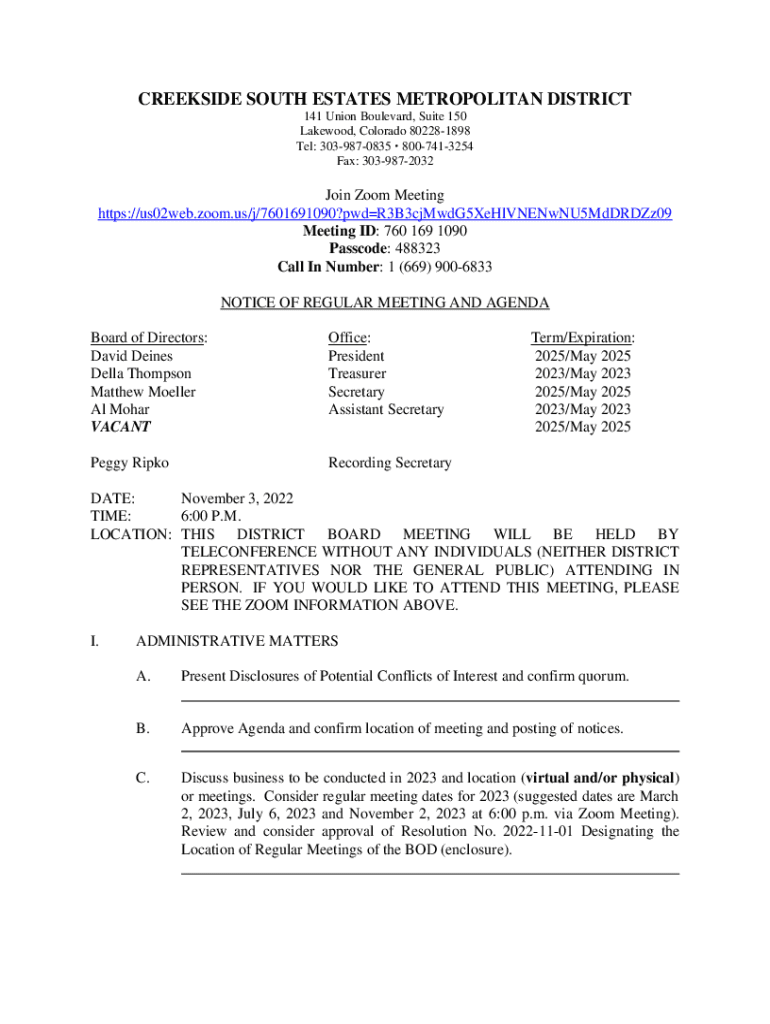CREEKSIDE SOUTH ESTATES METROPOLITAN DISTRICT 141 Union Boulevard, Suite 150 Lakewood, Colorado 802281898 Tel: 3039870835 8007413254 Fax: 3039872032Join Zoom Meeting https://us02web.zoom.us/j/7601691090?pwdR3B3cjMwdG5XeHlVNENwNU5MdDRDZz09