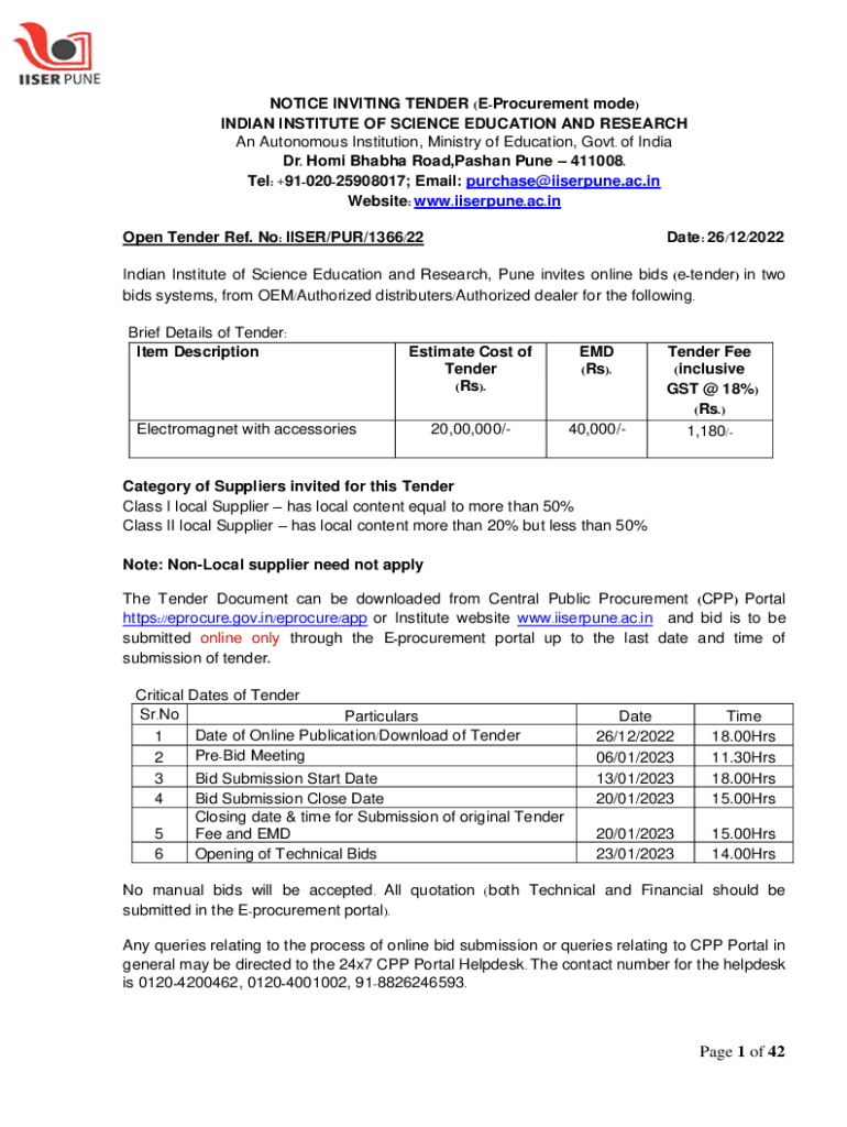 NOTICE INVITING TENDER (Procurement mode) INDIAN INSTITUTE OF SCIENCE EDUCATION AND RESEARCH An Autonomous Institution, Ministry of Education, Govt. of India Dr. Home Baha Road, Pasha Pune 411008.
