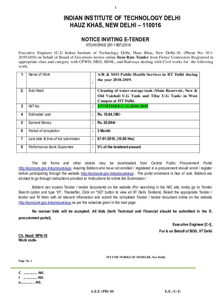 1INDIAN INSTITUTE OF TECHNOLOGY DELHI HAUL HAS, NEW DELHI 110016 NOTICE INVITING TENDER IIT/WORKS (SP1997)/2018 Executive Engineer (CI) Indian Institute of Technology Delhi, Haul Has, New Delhi16.