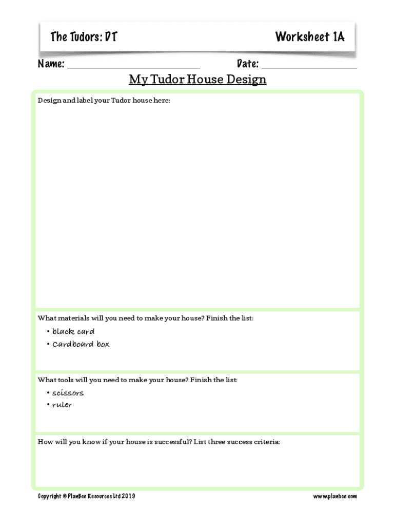 The Tudors: Worksheet 1AName: ___Date: ___My Tudor House Design and label your Tudor house here:What materials will you need to make your house? Finish the list: black card Cardboard what tools will