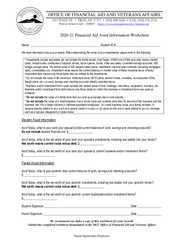 Get the free 2020-21 Financial Aid Asset Information Worksheet