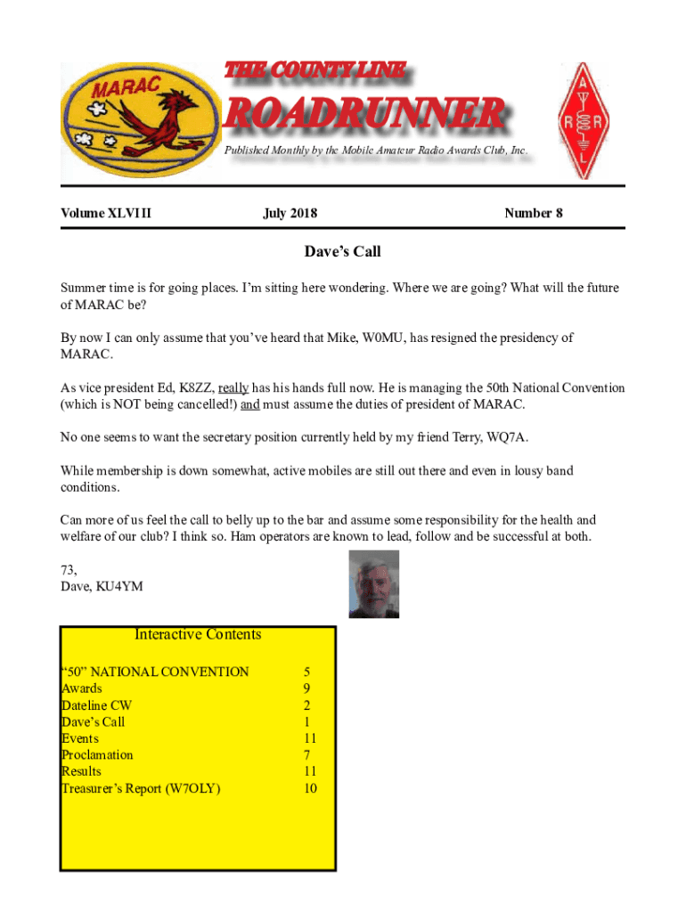 THE COUNTY LINEROADRUNNER Published Monthly by the Mobile Amateur Radio Awards Club, Inc. Volume XLVIIIJuly 2018Number 8Daves Call Summer is for going places. I'm sitting here wondering. Where we