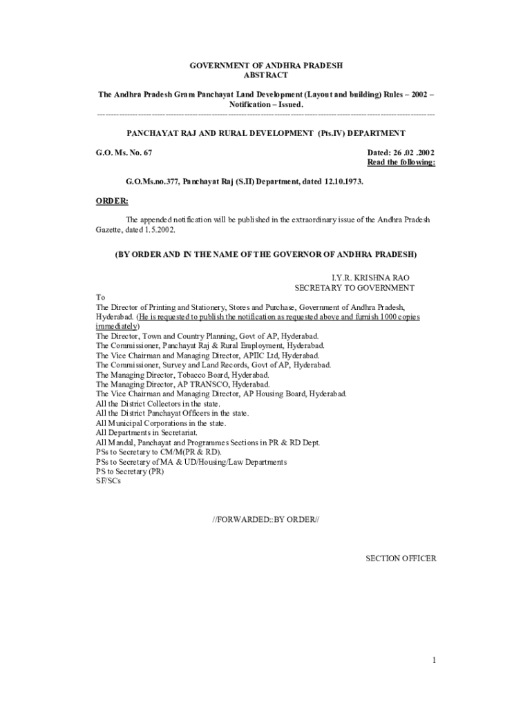 GOVERNMENT OF ANDHRA PRADESH ABSTRACT The Andhra Pradesh Gram Penchant Land Development (Layout and building) Rules 2002 Notification Issued. PENCHANT RAJ AND RURAL DEVELOPMENT (Pts.IV) DEPARTMENT
