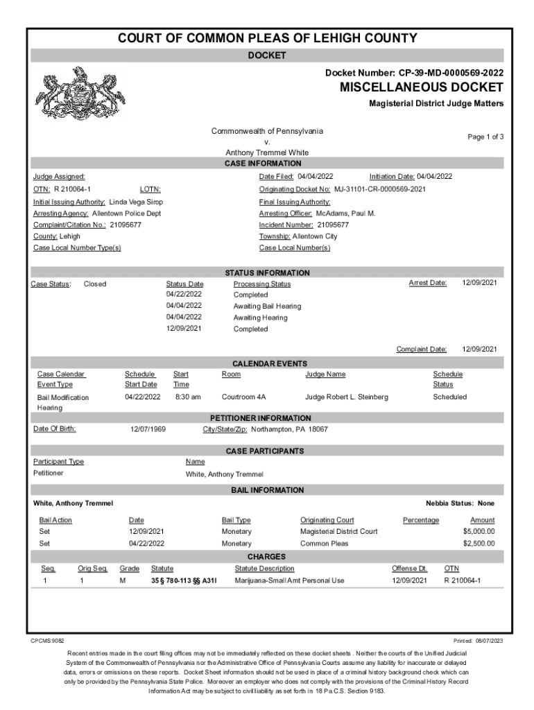 COURT OF COMMON PLEAS OF LEHIGH COUNTY DOCKET Number: CP39MD00005692022MISCELLANEOUS DOCKET Magisterial District Judge Matters Commonwealth of Pennsylvania v. Anthony Trammel White CASE INFORMATION