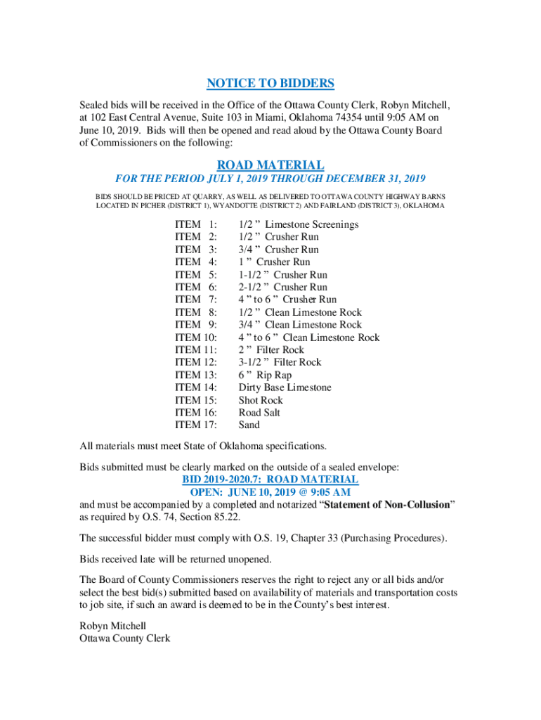 NOTICE TO BIDDERS Sealed bids will be received in the Office of the Ottawa County Clerk, Robyn Mitchell, at 102 East Central Avenue, Suite 103 in Miami, Oklahoma 74354 until 9:05 AM on June 10, 2019.