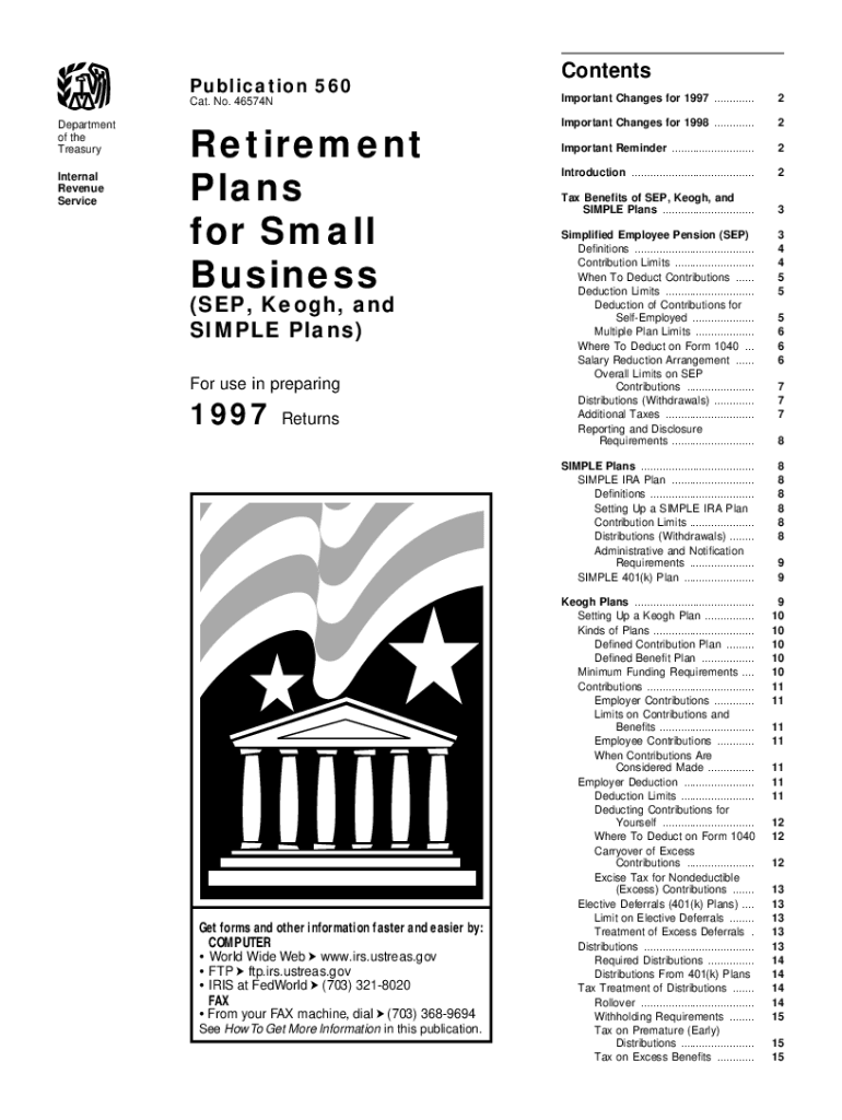 Publication 560 Cat. No. 46574 N Department of the Treasury Internal Revenue ServiceRetirement Plans for Small Business (SEP, Keogh, and SIMPLE Plans) For use in preparing1997ReturnsGet forms and