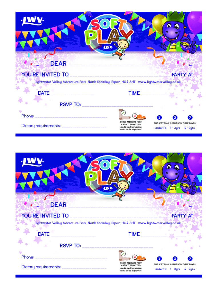 DEAR ___ YOU'RE INVITED TO ___ PARTY AT Light water Valley Adventure Park, North Stanley, Ripen, HG4 3HT www.lightwatervalley.co.ukDATE ___TIME ___RSVP TO: ___ Phone: ___ Dietary requirements: ___SHOES