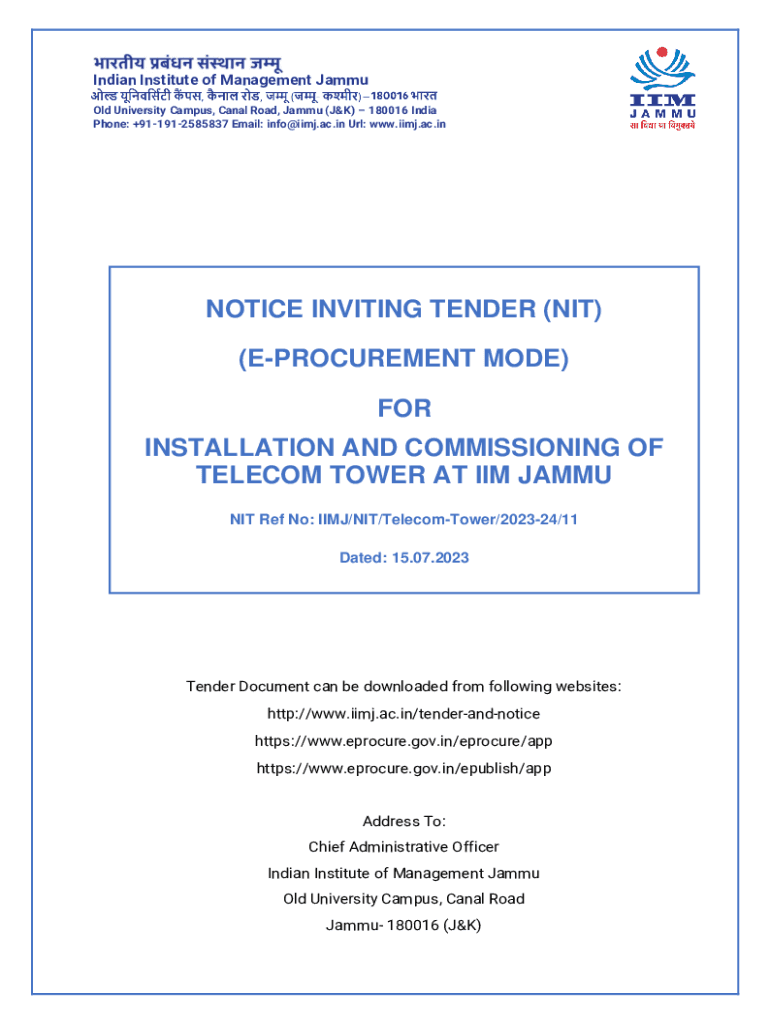 Indian Institute of Management Jammy Old University Campus, Canal Road, Jammy (J&K) 180016 India Phone: +911912585837 Email: info@iimj.ac.in URL: www.iimj.ac.inNOTICE INVITING TENDER (NIT) (PROCUREMENT